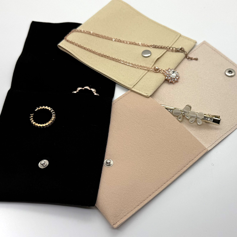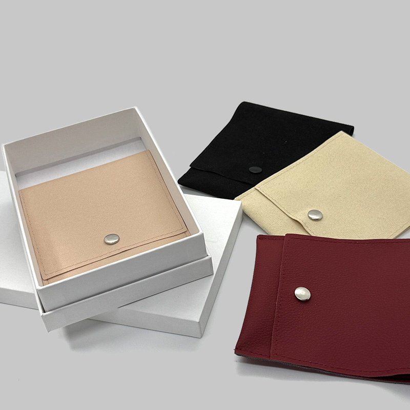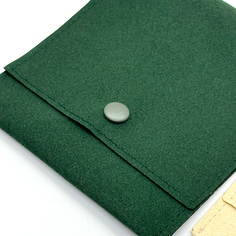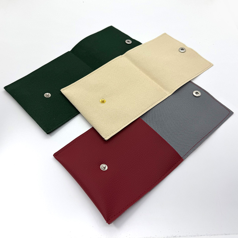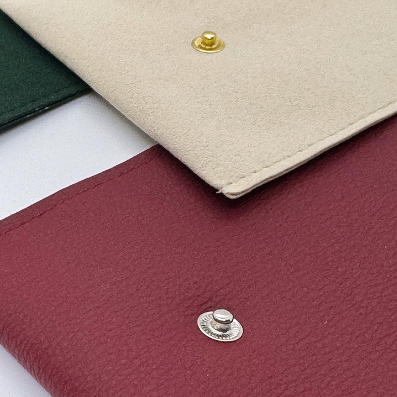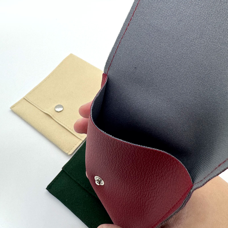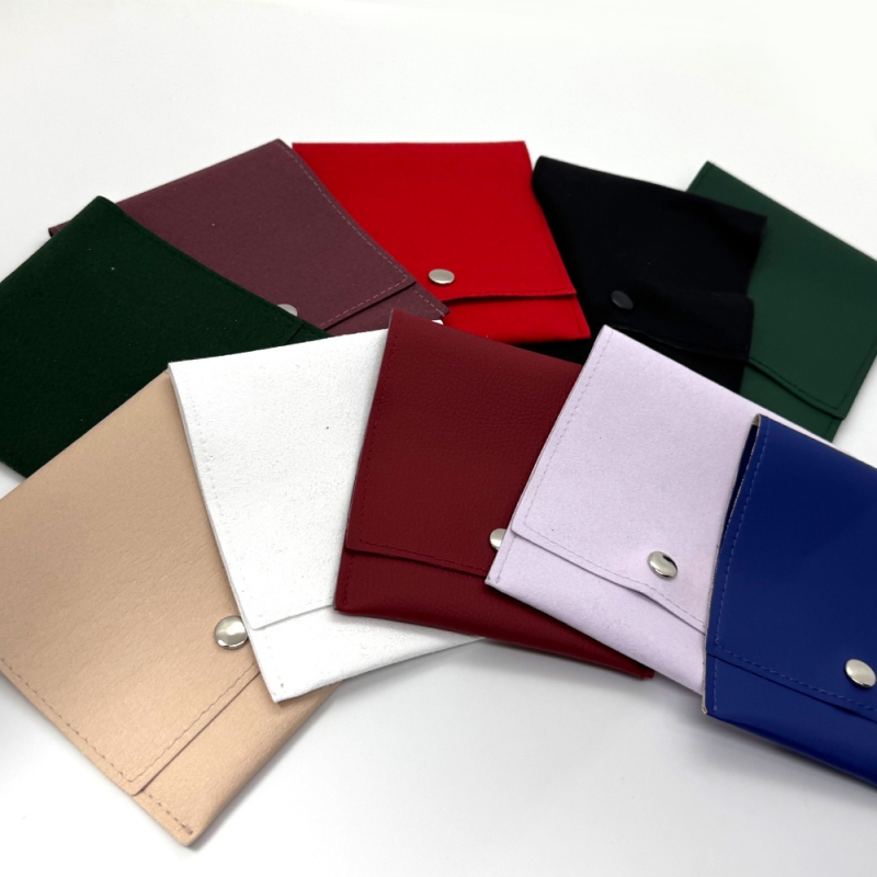 SIZE 가로 95mm 세로 110mm ![]() 원단과 가죽으로 제작된 파우치인데요 이런 파우치 형태가 요즘 주얼리 브랜드에서도 많이들 사용하시더라고요! 파우치 위에 브랜드 로고를 새긴다던가 브랜드 색상을 맞추는 형식으로 개성 있게 제작할 수 있습니다! ![]() ![]() 안쪽도 깔끔하게 마감되어 있고 주얼리를 넣기 위해 부드러운 원단으로 마감할 수도 있습니다 ![]() ![]() ![]() 마감 경우 똑딱이 버튼 형식의 장식으로 마무리되어 있습니다 또는 장식 부분은 없이 제작하는 경우도 있습니다 ![]() 이렇게 다양한 색상으로 제작이 가능하며 원단에 재질에 따라서도 실제품경우 분위기가 달라지기 때문에 제작을 원하시는 경우 원단의 느낌을 직접 확인하시는 걸 추천드려요! ![]() 케이스에 스펀지나 패드 말고 파우치는 넣는 방법도 요즘 많이들 사용하시는 거 같아요!