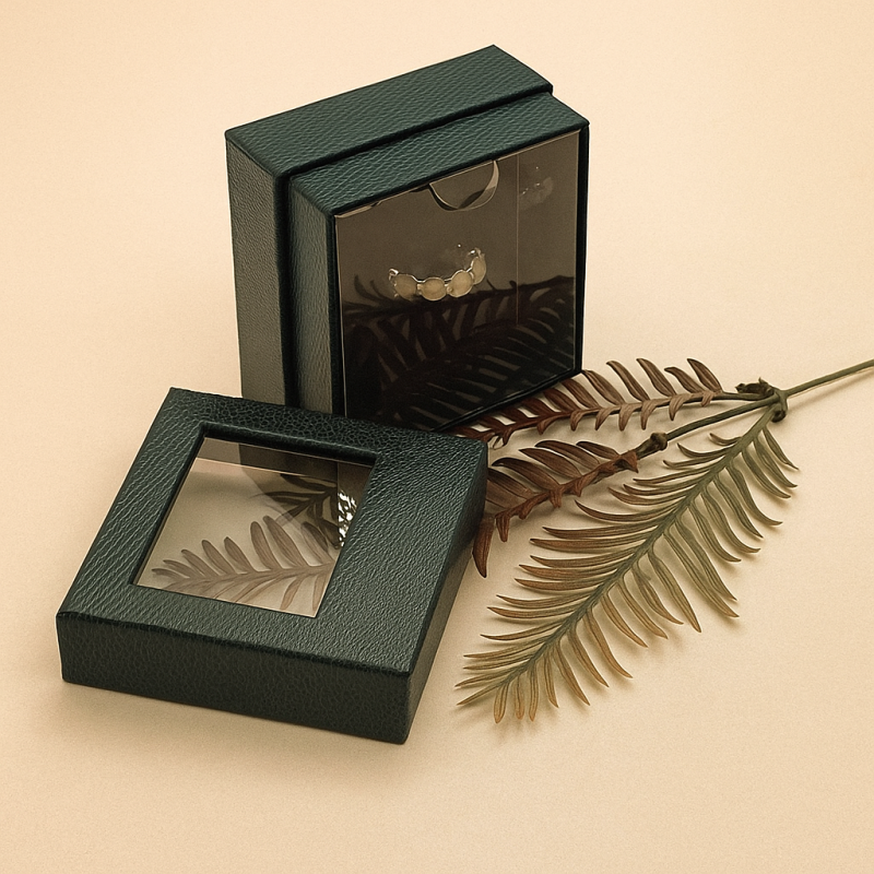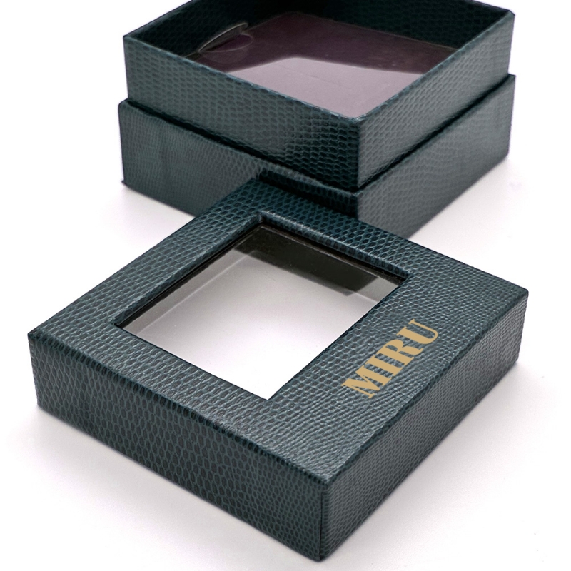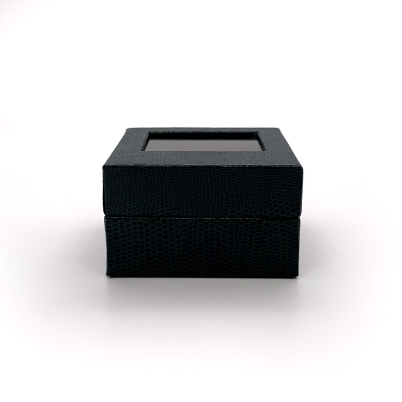 SIZE 가로 70mm * 세로 70mm * 높이 45mm 해당 샘플의 큰 특징 중 하나는 바로 고급스러운 가죽 패턴입니다 일반 종이 박스는 매끈해서 조금 단조롭게 느껴지는데, 이건 손끝으로 만졌을 때 입체감이 살아 있어서 훨씬 고급스럽게 느껴집니다 케이스를 열지 않아도 안에 있는 제품이 보이니까, 마치 전시된 듯한 느낌을 줄 수 있거든요. 전면에는 브랜드 로고를 넣을 수 있습니다~ 금박 / 은박 등 다양한 컬러 선택도 가능해 브랜드 이미지에 맞춰 고급 포인트를 줄 수 있어요!